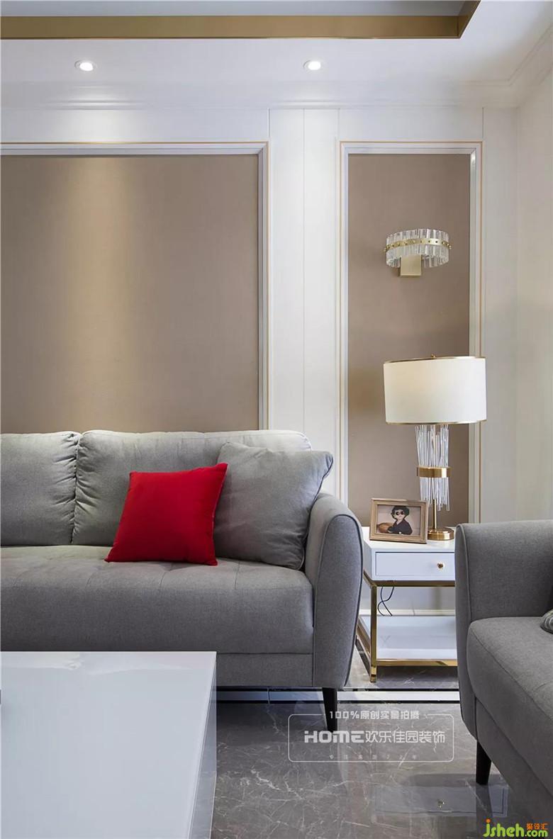 除了色彩上的表現(xiàn)力,材質(zhì)的使用上也完全滿足風(fēng)格該有的氣質(zhì),灰色的沙發(fā)和大理石奠定沉穩(wěn)基調(diào);背景墻是白色墻板和質(zhì)感細(xì)膩的金色墻布的組合,金色元素勾勒,呈現(xiàn)精致時尚的輕奢空間。