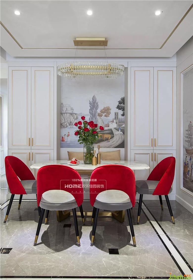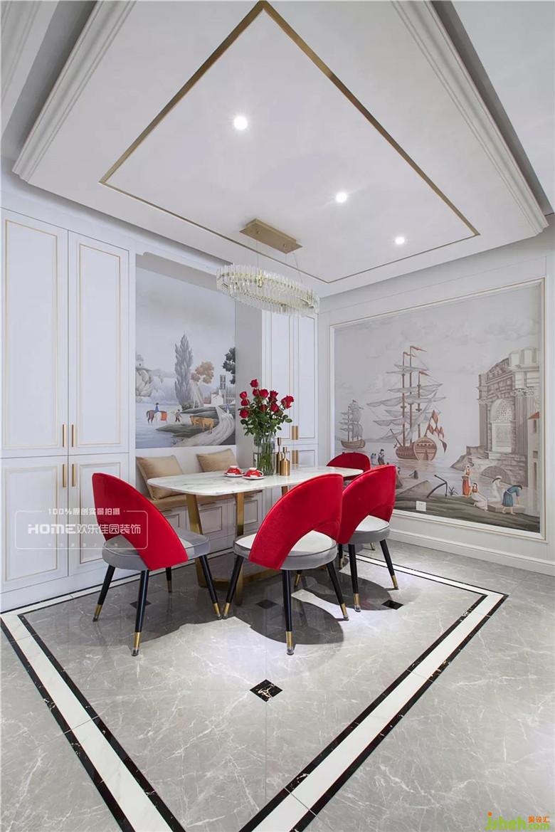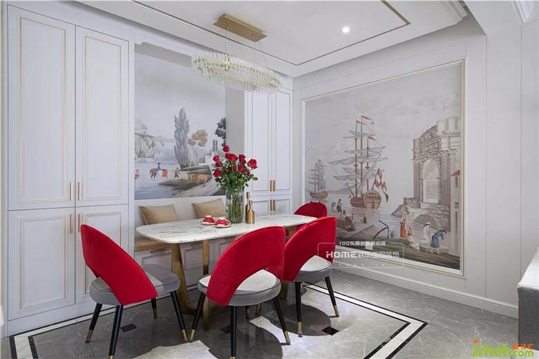 餐廳是卡座的形式,大面的白色用紅色餐椅點綴,墻面上是異域風(fēng)格墻畫,用餐氛圍時尚活躍,是一家人交流的好地方。