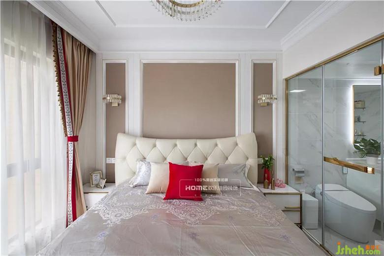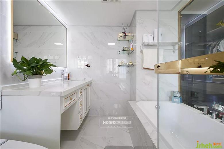 透明的主衛(wèi)生間可以擴(kuò)大空間視覺感,白色和金色的搭配讓空間清爽精致,讓整個主臥既時尚又滿足使用功能