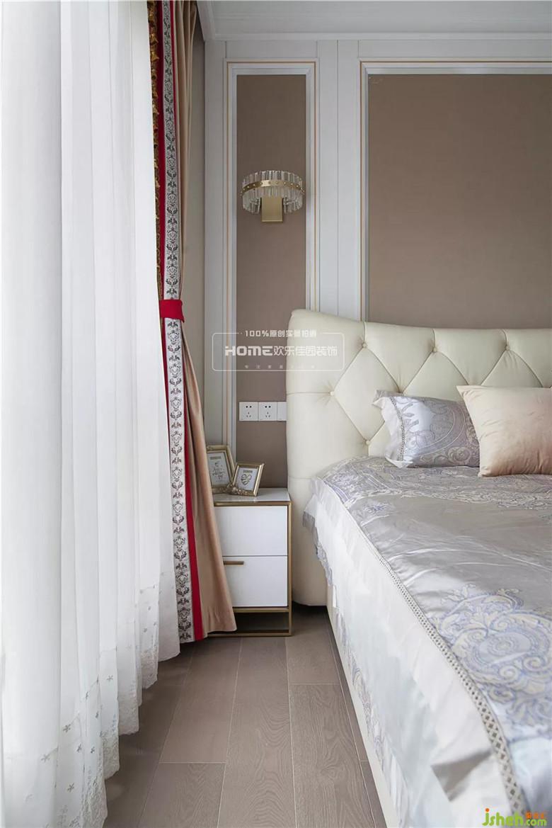 主臥室面積不大,要滿足女主人對更衣間的需求,改變了主臥室的進(jìn)門方向并設(shè)計(jì)成隱形門,直接用電視背景墻來分隔,留出了步入式更衣間的位置,增大了主臥室的面積。