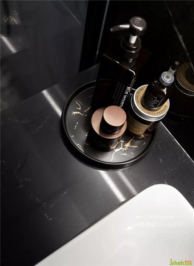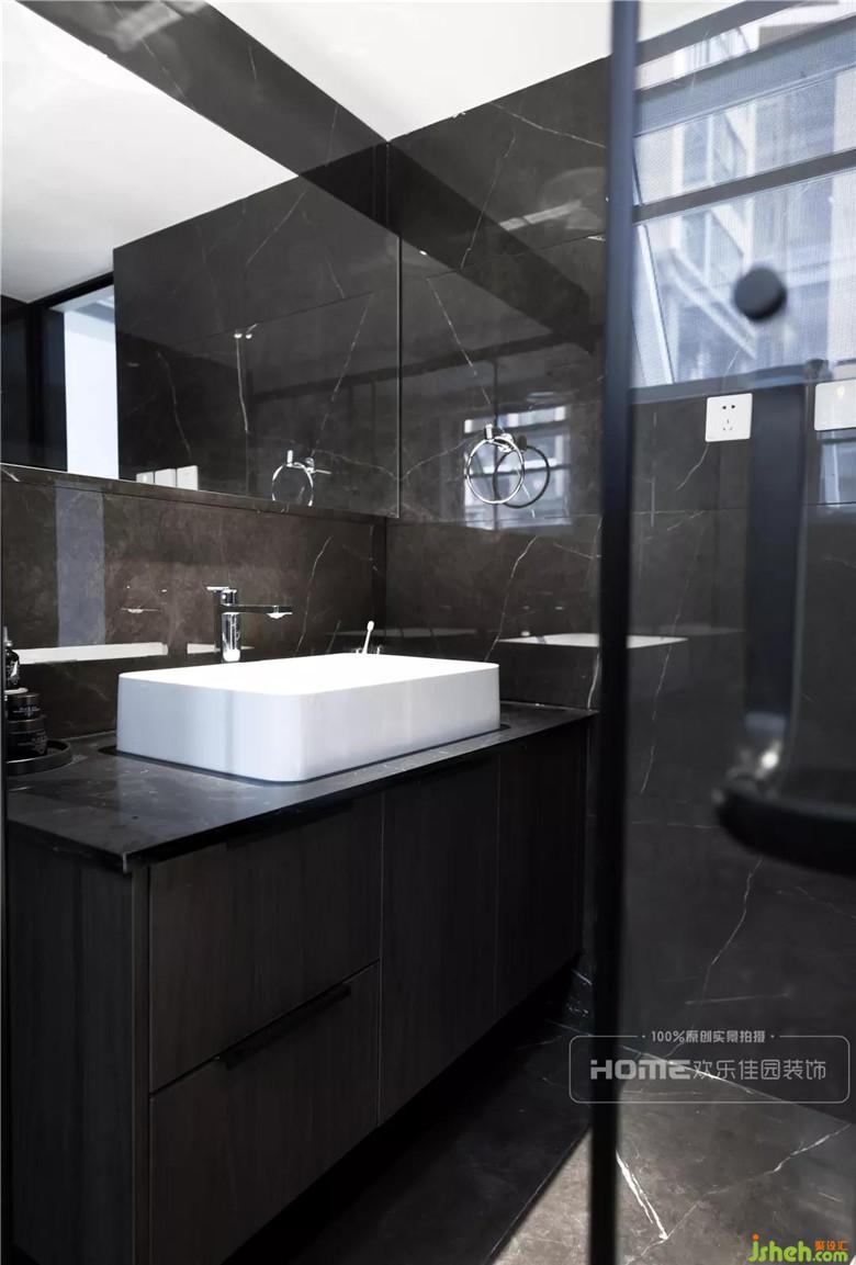 主衛(wèi)生間淋浴區(qū)與洗漱區(qū)用深淺色彩劃分,洗漱區(qū)深色墻地磚結(jié)合黑色大理石臺(tái)面,時(shí)尚簡(jiǎn)約中流露出個(gè)性與獨(dú)特。