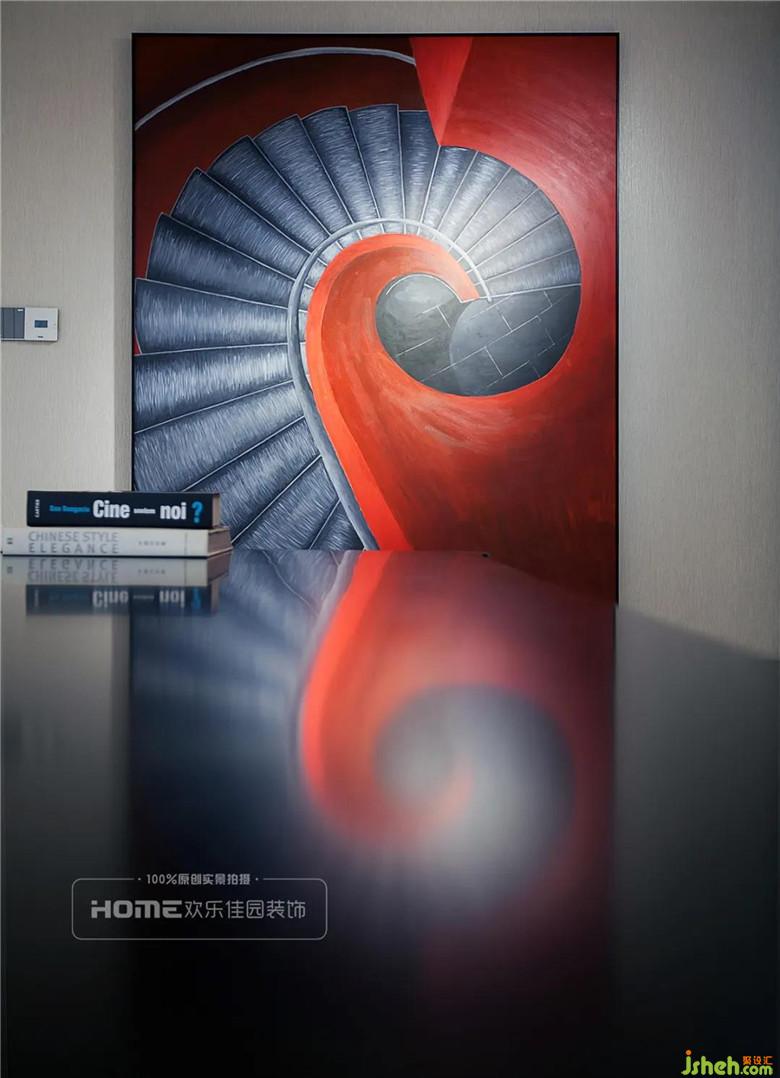 書(shū)房都是大面的處理,白色涂料的細(xì)膩與淺灰色墻紙的粗糙,有對(duì)比,有融合。黑色的家具在點(diǎn)光源的照射下更顯高級(jí)。業(yè)主親筆的巨型畫(huà)作,讓書(shū)房嚴(yán)肅的空間氛圍,頓時(shí)熱烈了起來(lái)。