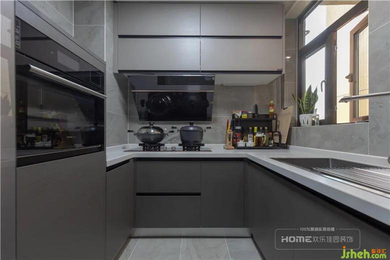廚房設(shè)計中臺面的白色+櫥柜面板的灰色,豐富了空間層次,u型的布局考慮了使用的便利,功能的合理規(guī)劃大大提高了生活的幸福指數(shù)。