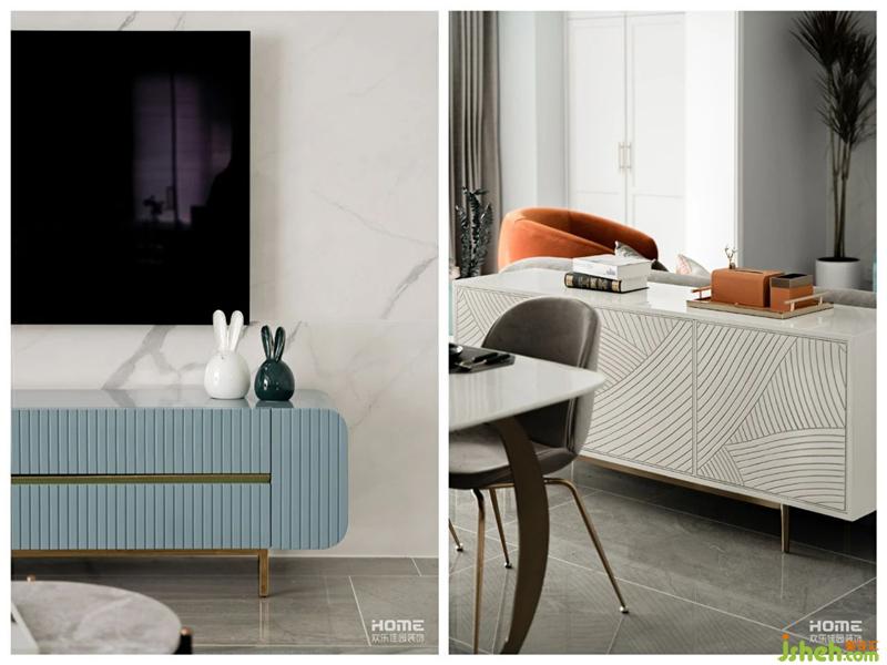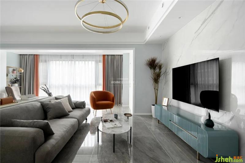 由于房屋為四室兩廳雙衛(wèi),整個空間結構中動靜分區(qū)合理,陽臺比較大,朝東光線好。設計師在寬尺橫廳的空間中沿過道墻面結合入戶空間形成L型的儲物柜位置,既增加室內的儲物空間,也讓空間的整體性更好,也進一步解決了電梯間的噪音問題。