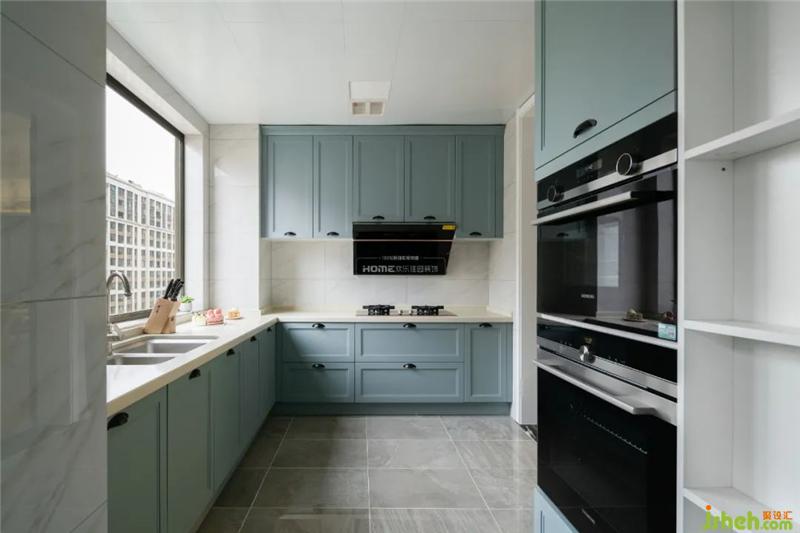 廚房整體采用白色調,搭配著淡藍色元素,呈現出清新淡雅的感覺。合理布局洗碗機、蒸烤箱等廚房設施,使得空間更大、更便捷。將原有生活陽臺空間納入到廚房空間中,形成獨立的廚房家電操作及儲放區(qū),烹飪區(qū)與家電區(qū)分區(qū)使用,空間最大化的同時讓空間的利用率更高。