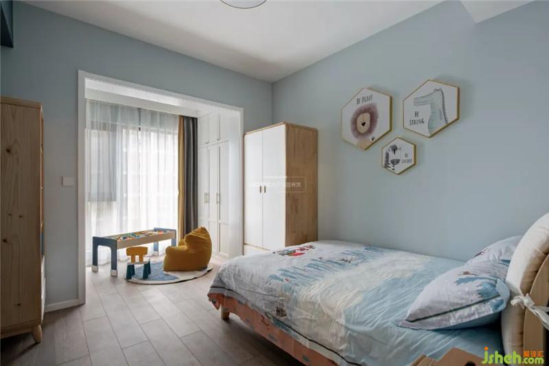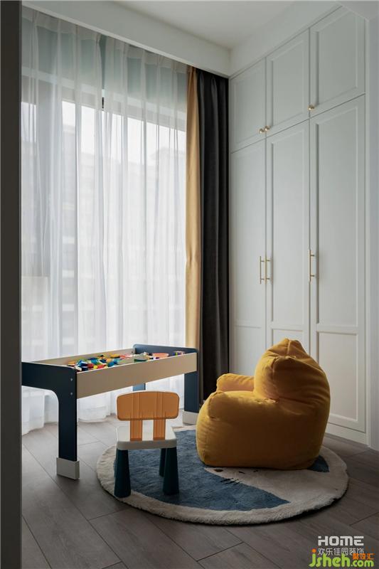 兒童房采用成品家具做空間布局,已于根據孩子年齡以及空間需求更換空間布局,在房間內家居設計墻面采用磁性漆加黑板漆的方式,給孩子一個獨立且自由的空間。