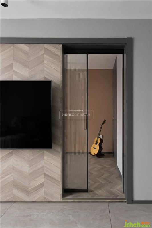 客廳與多功能活動室空間即相連又各為兩個(gè)獨(dú)立的空間,電視墻與多功能活動室的共用墻面采用魚骨拼地板上墻,與隱藏的長虹玻璃門形成材質(zhì)碰撞。