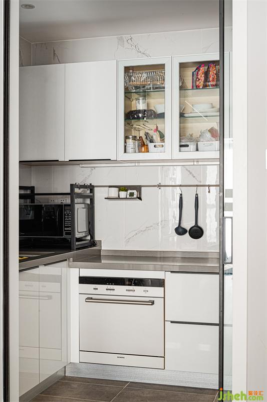 家居裝修用推拉玻璃門將廚房和餐廳隔開,玻璃門阻擋了油煙的蔓延,又保證了廚房的采光通透性,有利于家人們之間的溝通,做飯的時候隨時和外面的人溝通。廚房空間可開放可封閉,空間靈活性更高。