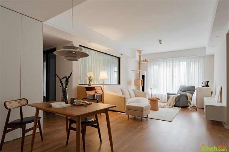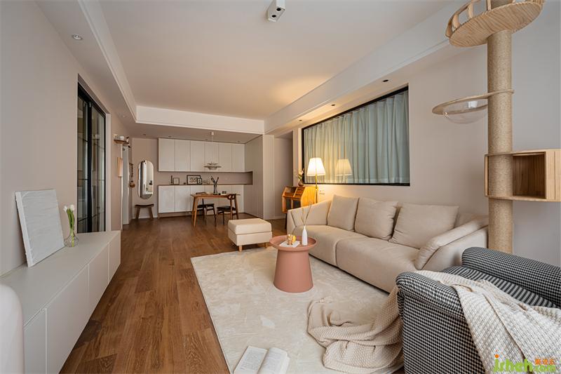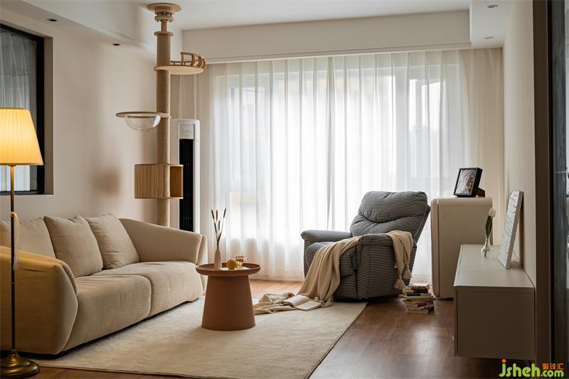 客廳整體色調(diào)采用奶白色搭配原木,營(yíng)造出清新的空間感。原木貓架的設(shè)計(jì),不僅讓貓咪有了嬉戲玩耍的地方,也讓整體空間延伸,增強(qiáng)視覺感。摒棄過度的華麗裝飾,簡(jiǎn)潔的線條,溫和的色調(diào),安寧地詮釋出靜謐的格調(diào)。