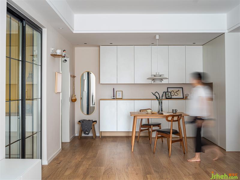 將入戶儲(chǔ)物柜以及餐邊柜整體處理,增加空間整體性。原木餐座椅與原木零食柜相呼應(yīng),白色系的主色調(diào)讓空間中的不同元素可以彼此連貫,材質(zhì)、色系之間對(duì)應(yīng),釋放家中的穩(wěn)重恬靜與平和。在這里就餐食欲一定會(huì)倍增!