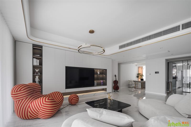 減少了隔斷的阻礙,讓空間更為寬敞通透,延伸感更強(qiáng),嵌入電視背景墻與柜體結(jié)合,延展客廳整體空間。