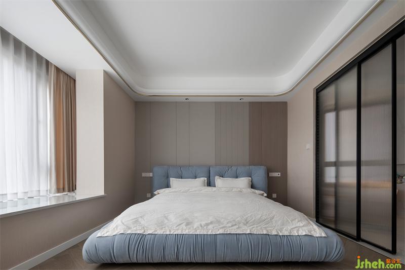 將原有衛(wèi)生間占比調(diào)小,滿足女業(yè)主獨(dú)立衣帽間的需求;用嵌入式衣柜作為獨(dú)立衣帽間的隔墻,增大空間儲(chǔ)物而又減少墻體阻隔。床頭造型利用干凈利落的線條和窗外靈動(dòng)綠植形成高反差,塑造強(qiáng)烈的視覺沖擊力,跳色的床體顏色淺淺的點(diǎn)綴頗有一種純粹而寂靜的空靈之美;身居其中緩解一天下來工作與家庭帶來的疲倦感,讓生活成為品質(zhì)的外延。