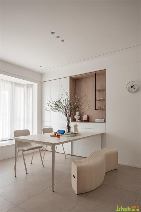 由于業(yè)主不太喜歡朋友到家里來,日常聚會幾乎都在外面。那么本案該重新定義客廳。我們放棄傳統(tǒng)的客廳布局,用多功能餐桌為中心,把原客廳打造成集閱讀.會客.辦公.用餐為一體的多功能空間。家裝設計利用吧臺劃分廚房跟原客廳空間。整面墻的收納我們選擇開放式與封閉式柜體結合讓空間增添趣味性。