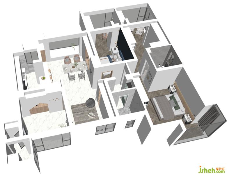 原戶型不足:餐廳和廚房較小,廚房采光差,生活陽臺小,主臥室收納空間少。