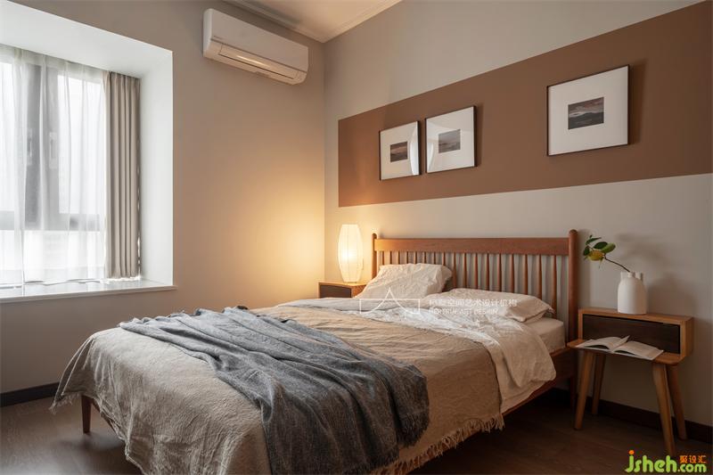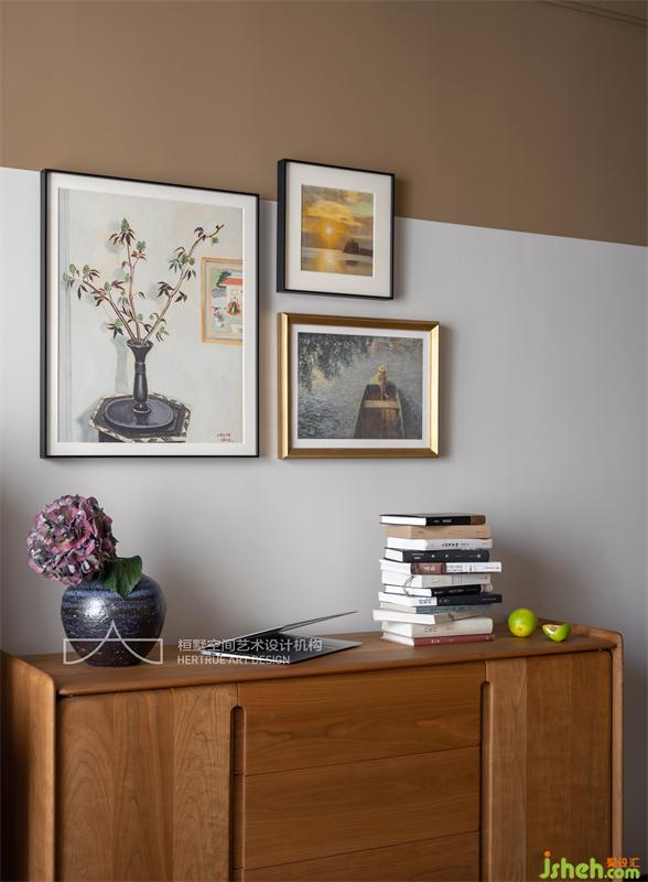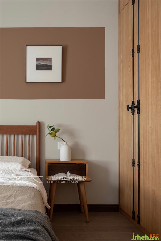 依舊是純粹的自然元素,裝飾畫刻意留白,宣紙臺(tái)燈的光線柔美而溫馨,天地鎖和實(shí)木衣柜的匹配,增添了一絲復(fù)古感。