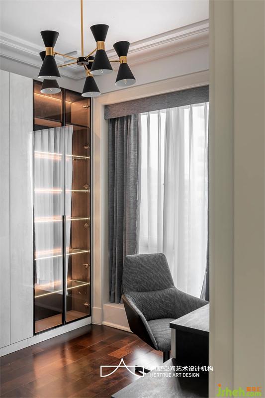 主臥書房干脆利落,簡單的黑白灰即是最好的詮釋。每一處角落都散落著靜謐的優(yōu)雅氣息,垂落的吊燈以金屬質(zhì)感盡顯優(yōu)雅,書桌一側(cè)的單人椅帶著幾許摩登氣息,慵懶而不失意趣。書柜穿插層層光帶,還原一處有態(tài)度、有溫度的書房空間。