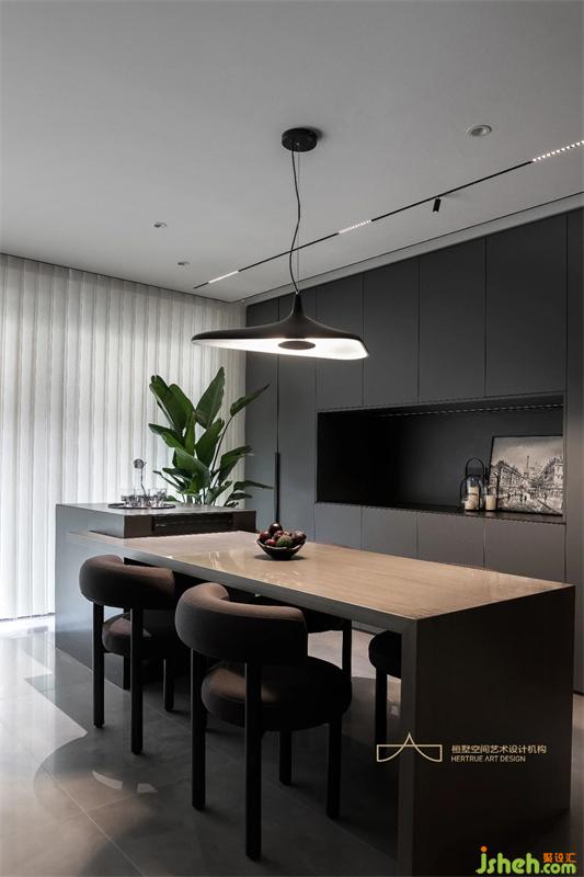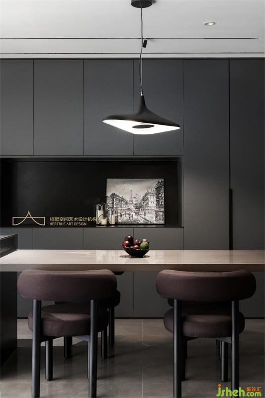 而餐廳是家中最具溫度和味覺記憶的空間,重慶裝修設(shè)計(jì)師以簡約實(shí)用的筆觸描繪這片美學(xué)場域。特意選用棕色餐桌椅平衡空間的冷冽感,另設(shè)一處中島增加空間互動(dòng)與實(shí)用性,內(nèi)斂深沉的收納展示柜滿足日常需求;個(gè)性獨(dú)特的吊燈靜靜垂落,暈白的燈光溫柔而高級,緩緩照亮家人間的溫情時(shí)刻。