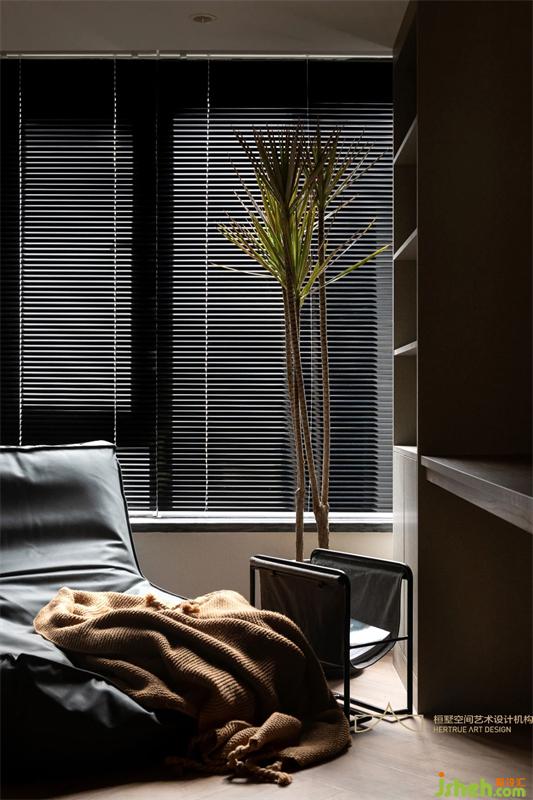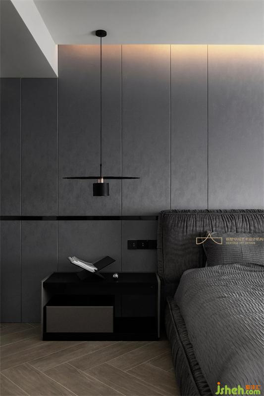 主臥空間整體也是深灰色調(diào)性,不同明度的灰調(diào)將空間拉出細(xì)膩的色彩層次,重慶裝修設(shè)計(jì)為臥室?guī)硪荒ǔ聊衩氐馁|(zhì)感。暖黃的燈光催化著情緒,寧和平穩(wěn)的心境在居室蔓延開來。