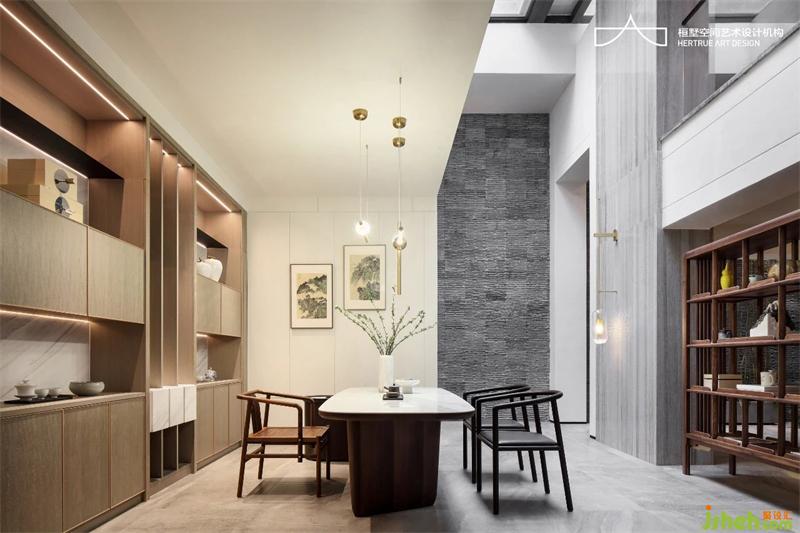 負(fù)樓層退合適距離為車庫入戶留出外前廳,整理過渡再入室內(nèi);解構(gòu)負(fù)二負(fù)一層功能動線,調(diào)整樓梯位置于一處貫穿上下,設(shè)置電梯位置,挑空入戶玄關(guān)、合理規(guī)劃天井借光,將需要安靜的茶室、收藏間、家庭影院置于負(fù)二層;成就入戶高挑空玄關(guān)以及茶室,于青磚竹韻里一室干凈明。