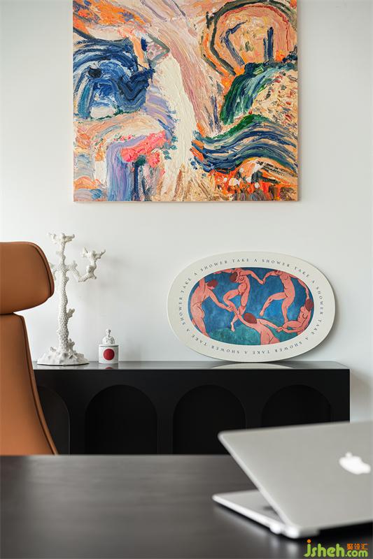 在棕色與黑色鋪構(gòu)的辦公空間基調(diào)中,一襲熱烈的壁畫色彩,驚艷而醇厚,燦爛而極致,引爆空間極致張力。