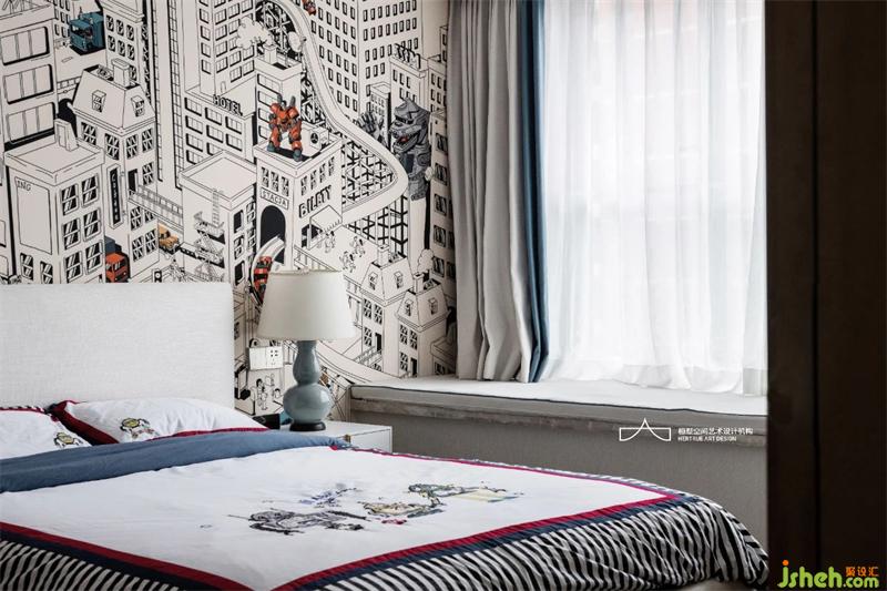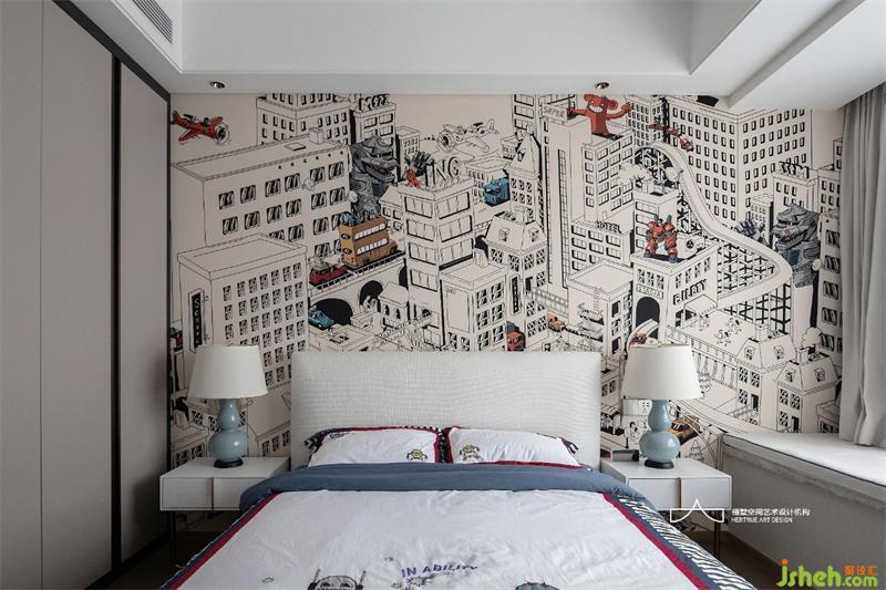 小兒子房間墻面增加涂鴉卡通墻布,