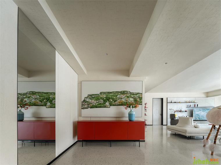 進(jìn)入從規(guī)范的現(xiàn)代主義電梯廳進(jìn)入,大紅色玄關(guān)柜搭配藝術(shù)畫作瞬間點(diǎn)亮眼前的空間,轉(zhuǎn)角墻面懸掛葉方的《虛實(shí)之間》,藝術(shù)品對情緒完成了一次微小而精妙的撞擊,它意味著你已步入全新的世界。