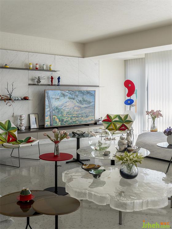由Ligne Roset和Edra北極熊沙發(fā)圍合的客廳區(qū)潔凈而夢幻,角落的一只Foscarini Orbital落地?zé)艉豌紤械腗oroso花瓣椅將場景代入夏加爾紛繁的想象之地。易使用的大小各異的茶幾由不同材質(zhì)在內(nèi)部奏響靈動(dòng)的曲調(diào),沒有任何一個(gè)角落是沉悶呆板的。