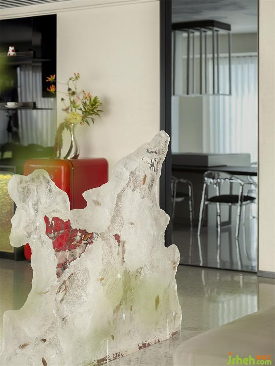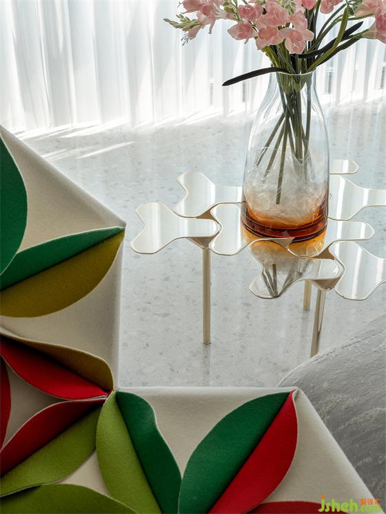由散落的花瓣和玻璃樹脂構(gòu)型而成的一系列家具和藝術(shù)品是來自設(shè)計(jì)公司的原創(chuàng)作品,這些被凝固了的云霧和水流構(gòu)成了空間詩性的貫穿,被凝固的這一刻又彰顯出力量。