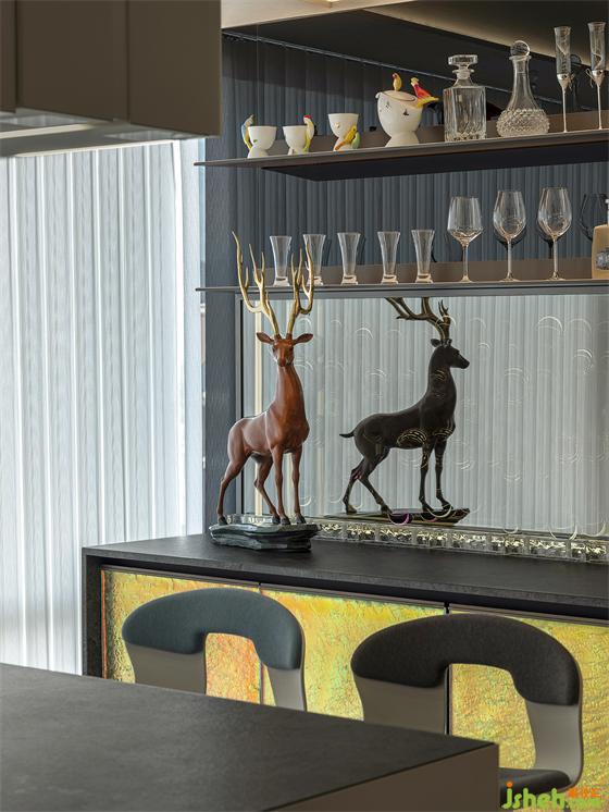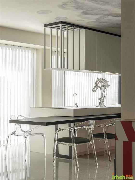 越過樹脂屏風(fēng),酒吧和餐廳與客廳對(duì)望。吊柜和地柜足有600公斤的中島經(jīng)過嚴(yán)謹(jǐn)?shù)慕Y(jié)構(gòu)論證最終得以在這個(gè)區(qū)域內(nèi)實(shí)現(xiàn)。