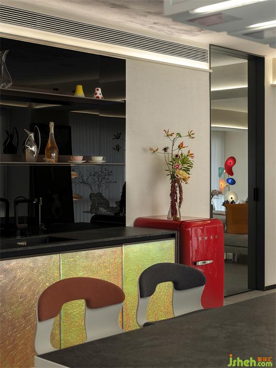 厚重的柜體與餐椅冰川滴落般的設(shè)計(jì)再次釋放剛?cè)岵?jì)的反差魅力。大平層私宅裝修設(shè)計(jì)隱于中島后的櫥柜面板材質(zhì)在不同視角下呈現(xiàn)由綠到紅的過度,與天花上轉(zhuǎn)印的巨幅睡蓮形成倒置的奇妙互看,整個(gè)區(qū)域似乎蕩漾與藝術(shù)與現(xiàn)實(shí)交融的湖面,古典與當(dāng)代交融。