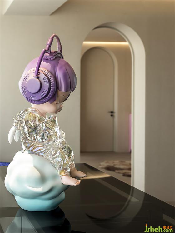 大平層私宅裝修設(shè)計(jì)拱形和柔軟的弧線由結(jié)構(gòu)延續(xù)到家具和配飾,糖果一般的甜蜜氛圍在亞麻色的基底上并不顯得唐突,反而調(diào)和了公共區(qū)紛繁層疊的細(xì)部,情緒在這里歸于和緩。