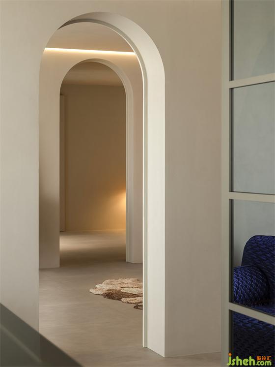 溫柔的大地色和弧線屬于年輕的家庭成員,從臥室到衛(wèi)生間再到畫室,拱形門洞和大尺度的推拉門使這幾個(gè)區(qū)域可以彼此連通自成一方天地,而氣流和陽光也會(huì)因此流動(dòng)起來。