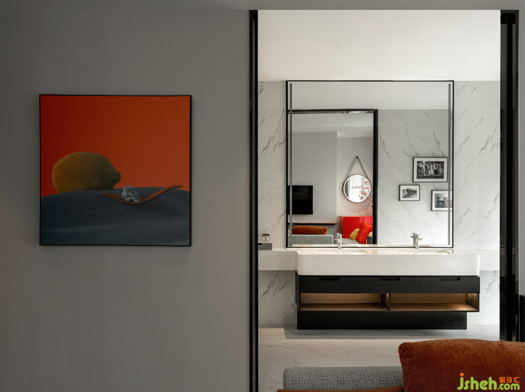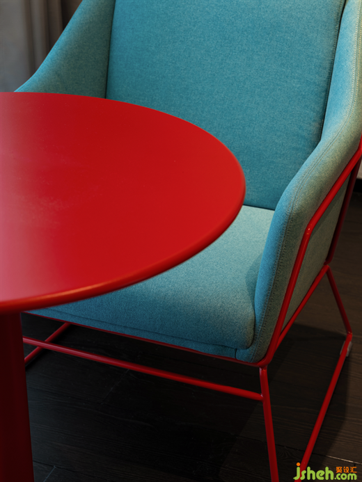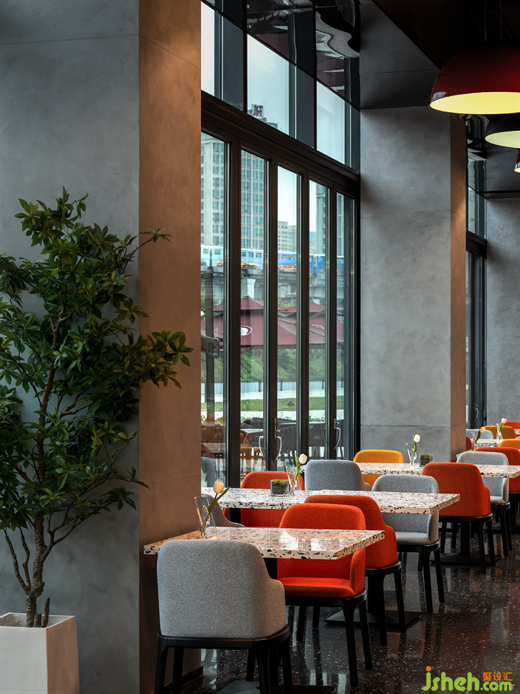 餐廳內(nèi)放置了水藍(lán)色的玻尿酸主題藝術(shù)畫,精品酒店設(shè)計為空間注入了層次之美,紅色、灰色座椅與水磨石桌面重疊交錯,輝映著光線的維度。若隱若現(xiàn)的窗外景色,為用餐空間帶來斷續(xù)的節(jié)律感。