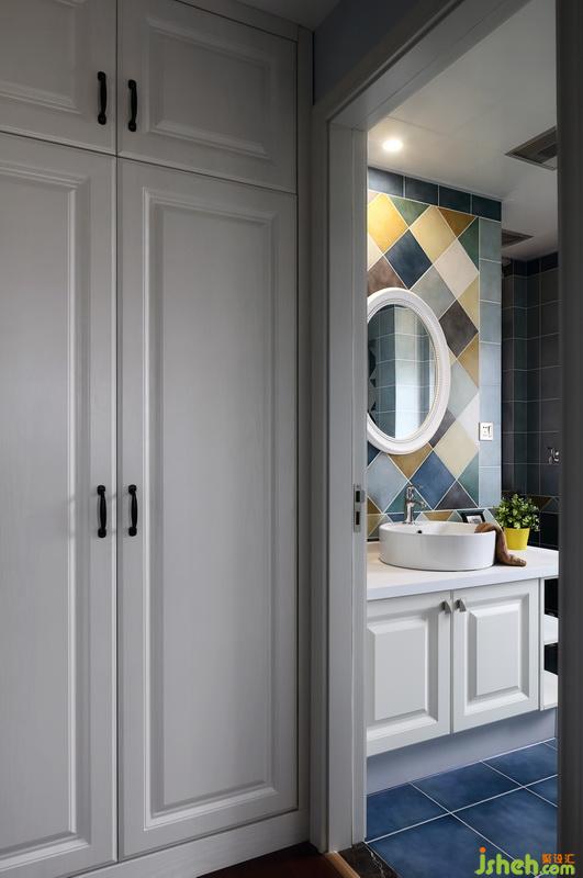衛(wèi)生間的瓷磚室內(nèi)設(shè)計(jì)師整體選用藍(lán)色系,衛(wèi)浴產(chǎn)品選用白色亮面,活躍整體空間;我們室內(nèi)設(shè)計(jì)師將一片方形瓷磚對(duì)角線切開(kāi)成三角線,拼貼出腰線效果和背景圖案,即豐富了空間層次,同時(shí)也節(jié)約造價(jià)。