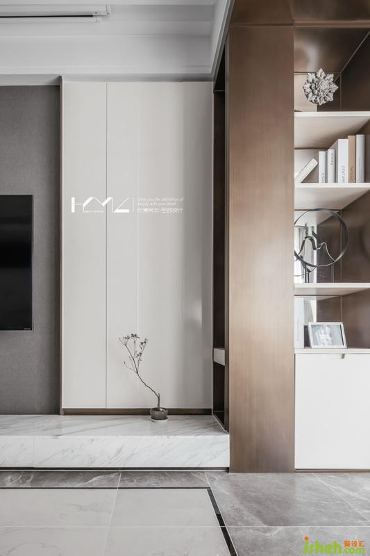 電視背景墻,運(yùn)用了國畫留白的處理手法,大面的白色元素,凹凸有致的烤漆面的背景護(hù)墻板加上白色石材電視柜,用古銅不銹鋼收邊,使得空間收放自如,栩栩如生。