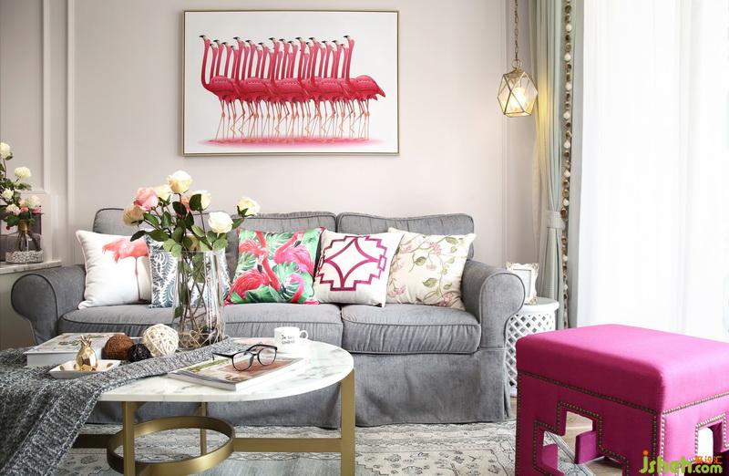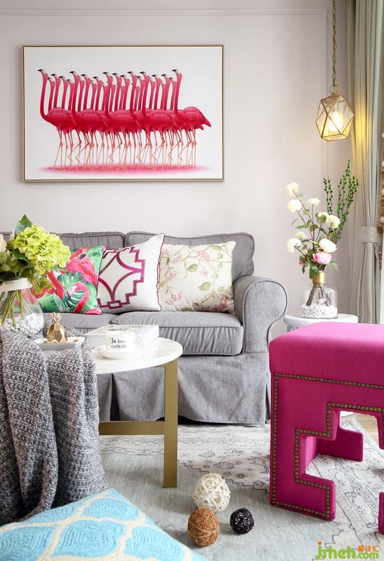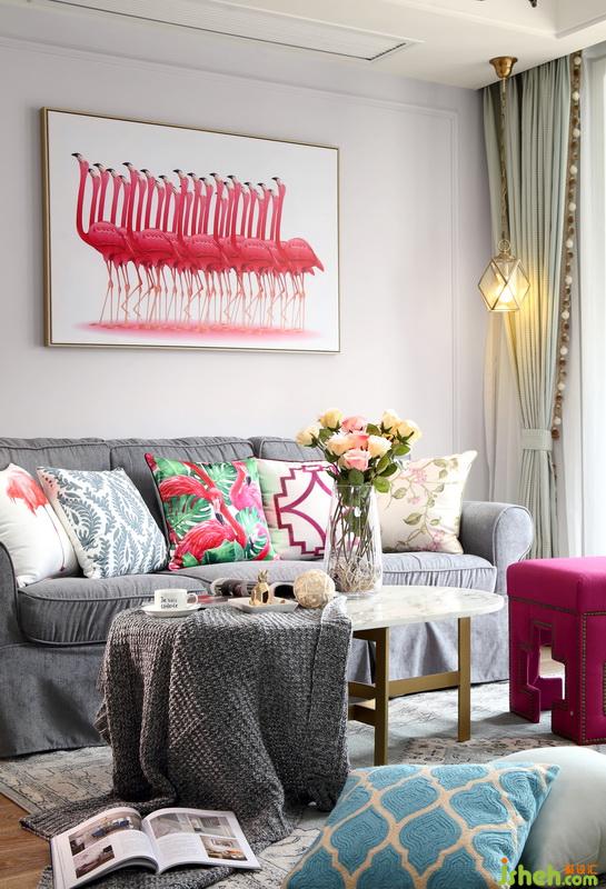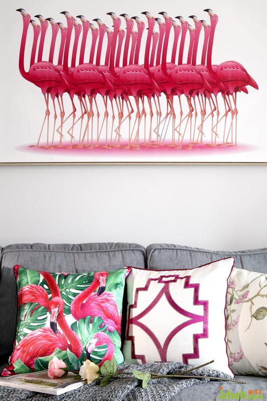 風(fēng)格與色彩定位在起初溝通階段本是溫暖的輕美式,設(shè)計(jì)初始,設(shè)計(jì)公司被一張色彩鮮艷的玫紅色調(diào)的火烈鳥掛畫所吸引,以畫為出發(fā)點(diǎn),顏色上更是大膽運(yùn)用了翠綠、淡藍(lán)、明黃等比較跳躍的色彩與玫紅搭配,加之灰度色過度,使整個空間呈現(xiàn)一種暖人心配的定調(diào)。