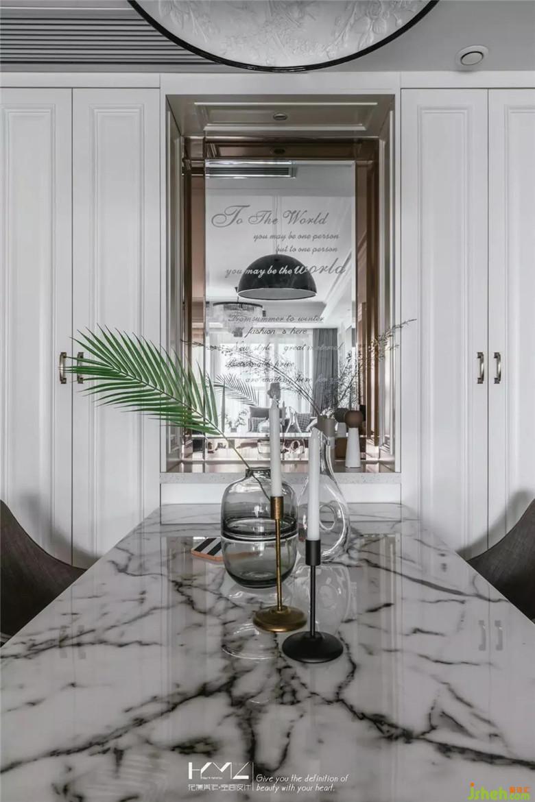 餐桌我們選用了六人位的長桌,桌面是白色紋理顯著的大理石,基座是古銅色金屬質(zhì)地,凸顯現(xiàn)代輕奢感。
