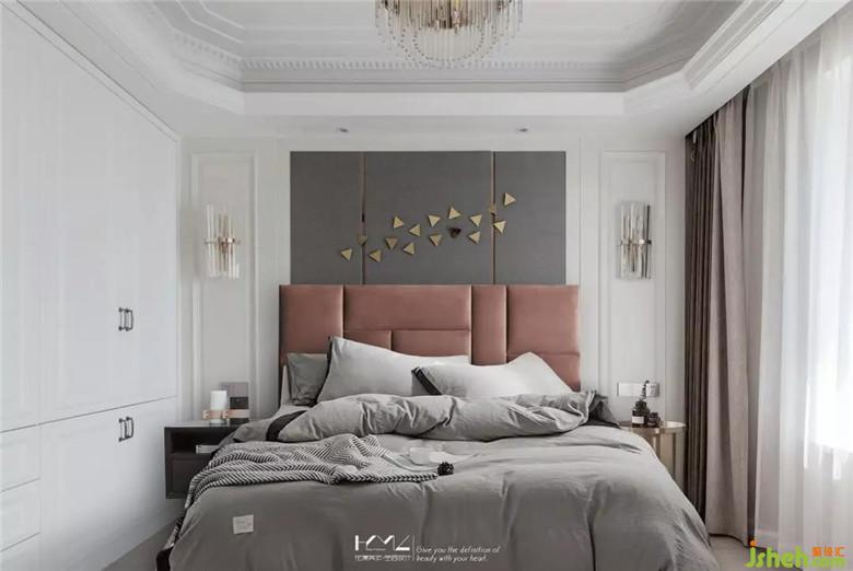背景墻中間部分運用硬包并鑲嵌香檳色金屬條,營造現(xiàn)代輕奢質(zhì)感,兩側(cè)白色疊級護墻板并搭配裝飾壁燈;床頭柜裝修公司選用了兩款樣式 ,方圓結(jié)合。