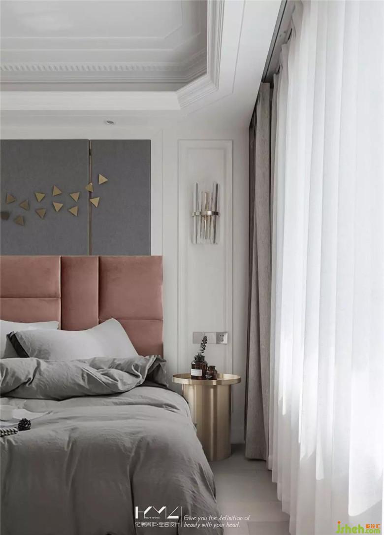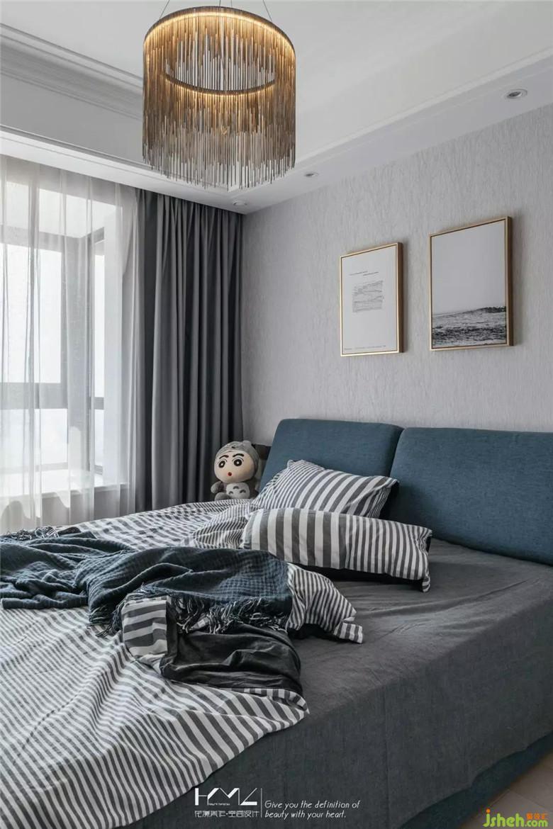 次臥設(shè)計簡潔明快,裝飾畫勾勒了香檳金的邊框,燈具的搭配是流蘇的金屬現(xiàn)代燈,造型唯美,軟裝的搭配上素雅而精致。