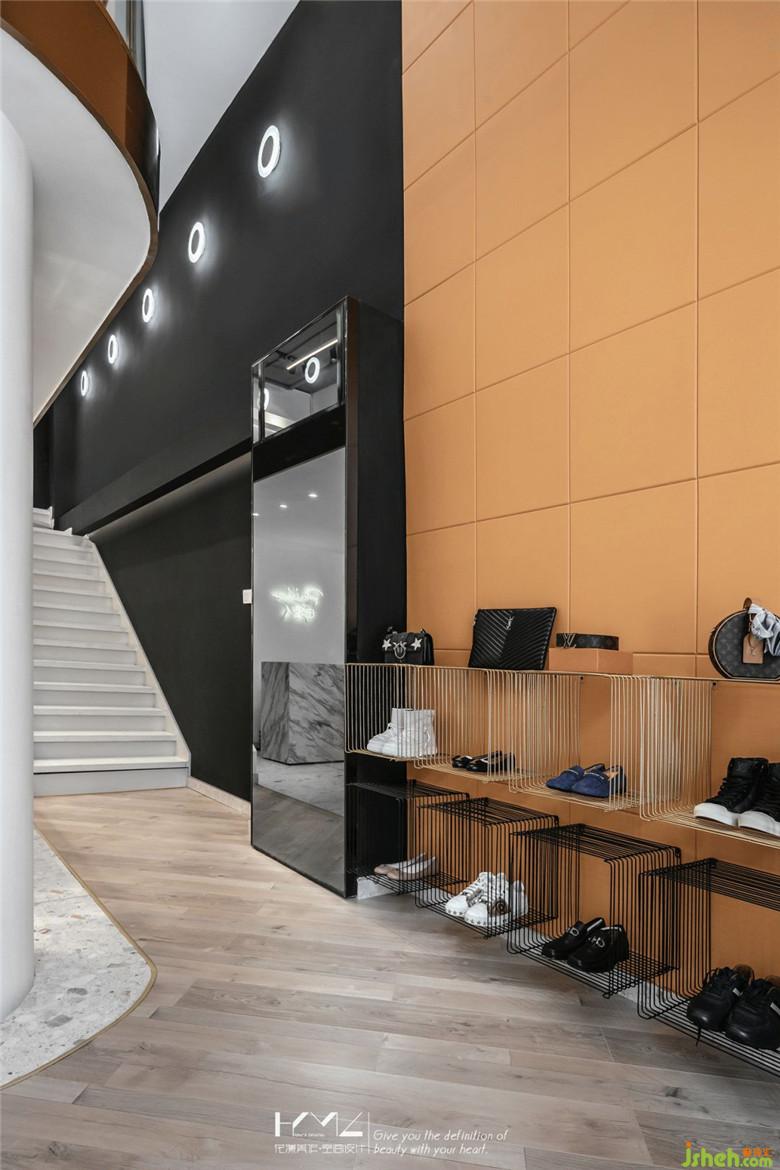 室內(nèi)空間并不大,挑高的結(jié)構(gòu),可以大大增加使用空間,但我們沒有完全將一二層一分為二,而是保證空間的整體感,局部架空,視覺上讓空間盡可能地高聳,而又能有著足夠的使用空間。入戶右手側(cè),整面橙色的硬包護墻,就是告訴我們的眼睛,空間的整體與高聳,同時也是定下整個設(shè)計的色彩基調(diào),華而優(yōu)雅。