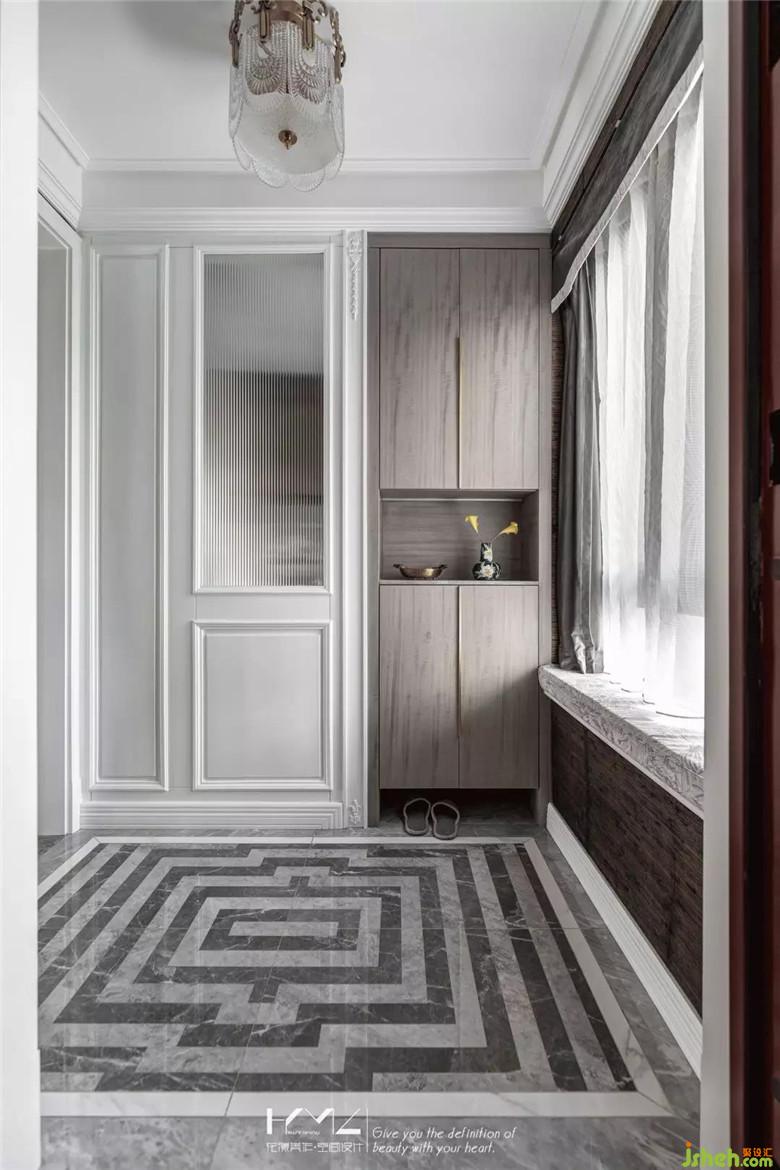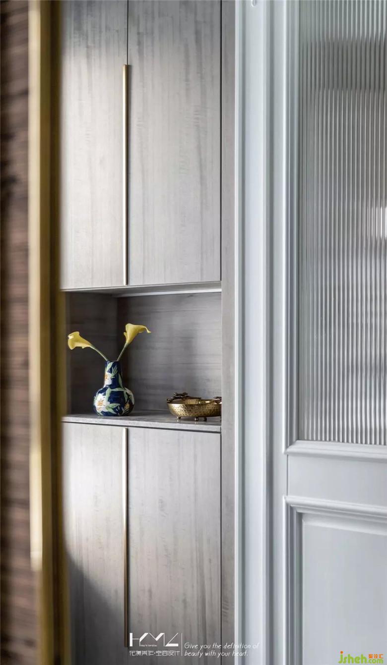 入戶門廳地面立體回紋圖形,后場切割雙拼地磚,由四塊組合而成,對面鞋柜,中層開放展架,隨手放置鑰匙和常用用品,下方懸空,方便日常更換的鞋子放置,柜門板特別選用了影木材質(zhì),質(zhì)感細(xì)膩。