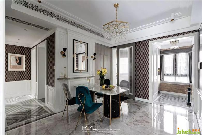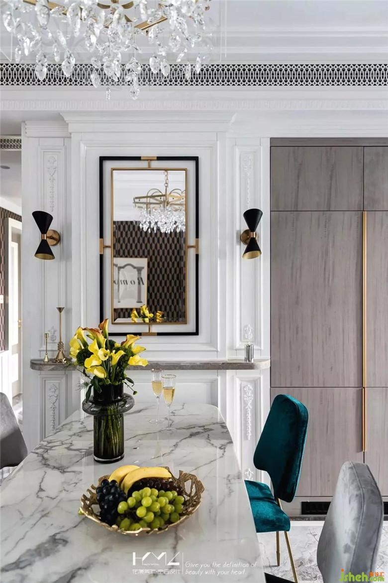 餐廳是整屋的中廳,整體想營造古典輕奢復(fù)古風(fēng),在主背景上,運(yùn)用帽頭,上下護(hù)墻分割,雕花,對稱黑金壁燈,金色框裝飾鏡這些元素揉搓融合,再結(jié)合水晶吊燈,石膏美式線條等一系列經(jīng)典美式元素,框出餐廳唯美動(dòng)人的輕奢風(fēng)采。