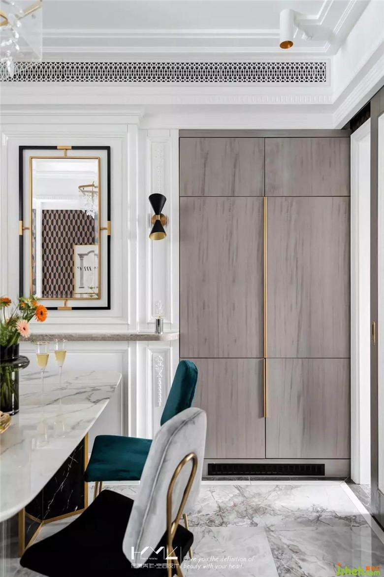 功能上,腰線處弧形大理石條板挑出,可放置裝飾品或者餐廳常用物品;冰箱亦放置在了餐廳,且作了隱形處理,與墻面護(hù)墻完美融合,與入戶鞋柜柜門,使用了同樣的影木材質(zhì),搭配香檳金色長把手,簡約精致。廚房定制了吊軌移門,大塊面的長虹玻璃嵌入,保證了餐廳的采光充足。