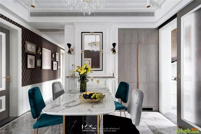配色上,餐椅的配色與客廳沙發(fā)配色呼應(yīng),湖水綠/黑灰的絲絨與金色細(xì)腿結(jié)合,餐桌則是黑白大理石的組合,壁紙則是英國cole&son的幾何系列,型號是112/5022,這種明顯的上下色塊區(qū)分,明暗有序,創(chuàng)造出一種低調(diào)復(fù)古的優(yōu)雅感,同時(shí)豐富空間層次細(xì)節(jié),護(hù)墻的分割比例細(xì)節(jié)組合提高了空間尊貴的調(diào)性。裝修公司