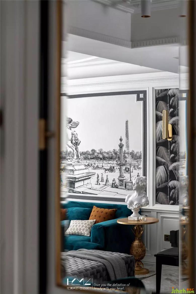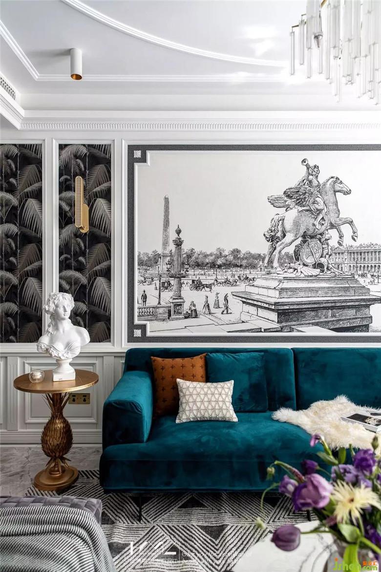 兩邊壁紙是英國cole&son的棕櫚葉系列,型號是95-1004,中間背景畫是一副名為《雕像》的壁畫,古老建筑物中風(fēng)雨侵蝕的雕像,意在傳遞一種永恒的精神,這也符合一個家的精神追求;流蘇水晶燈與頂面層次疊起的石膏線條豐富空間細(xì)膩層次,在主體家具的選型上,偏向現(xiàn)代風(fēng)格,意在詮釋混搭的意義,同時呈現(xiàn)中西合璧的折中主義精神。