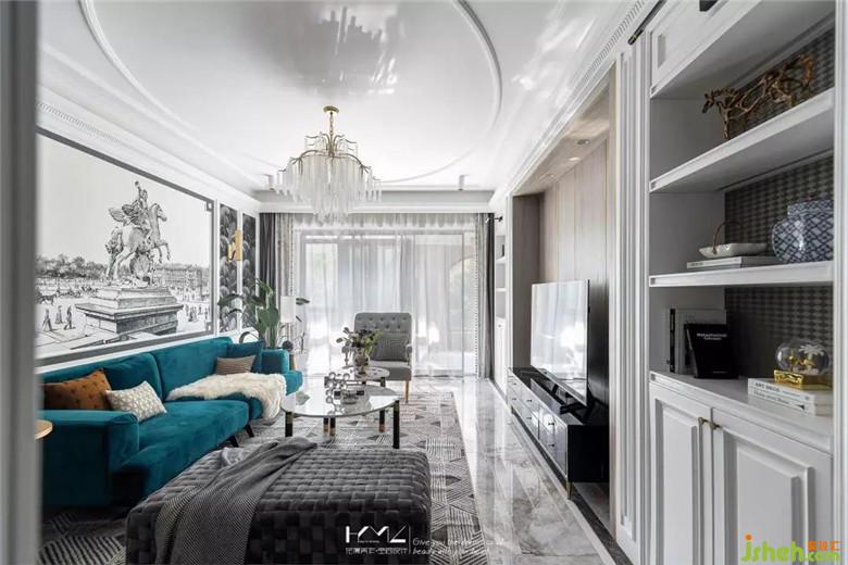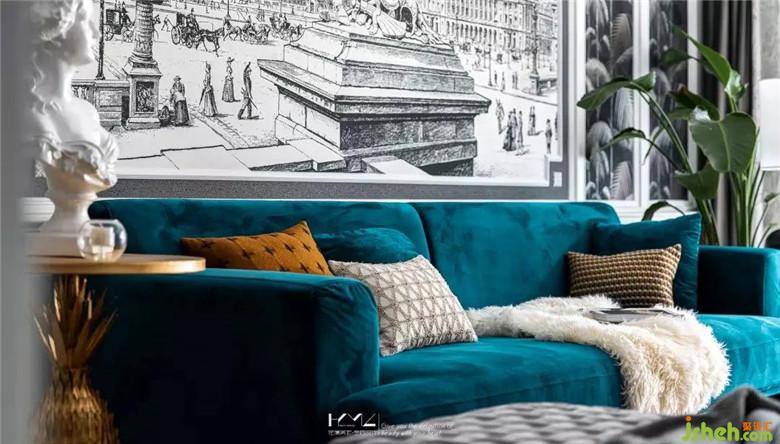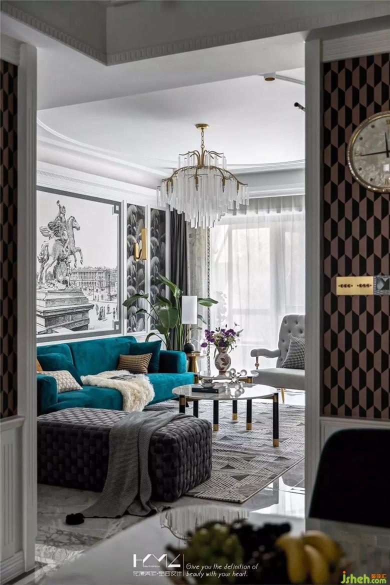 左邊是復(fù)古造型的金色邊幾,平衡呼應(yīng),編織款式的長條落地榻凳選用深灰絨,結(jié)合地面三角幾何拼接的地毯紋理,無一細(xì)節(jié)不體現(xiàn)美式與現(xiàn)代、繁復(fù)與簡約的彼此融合。