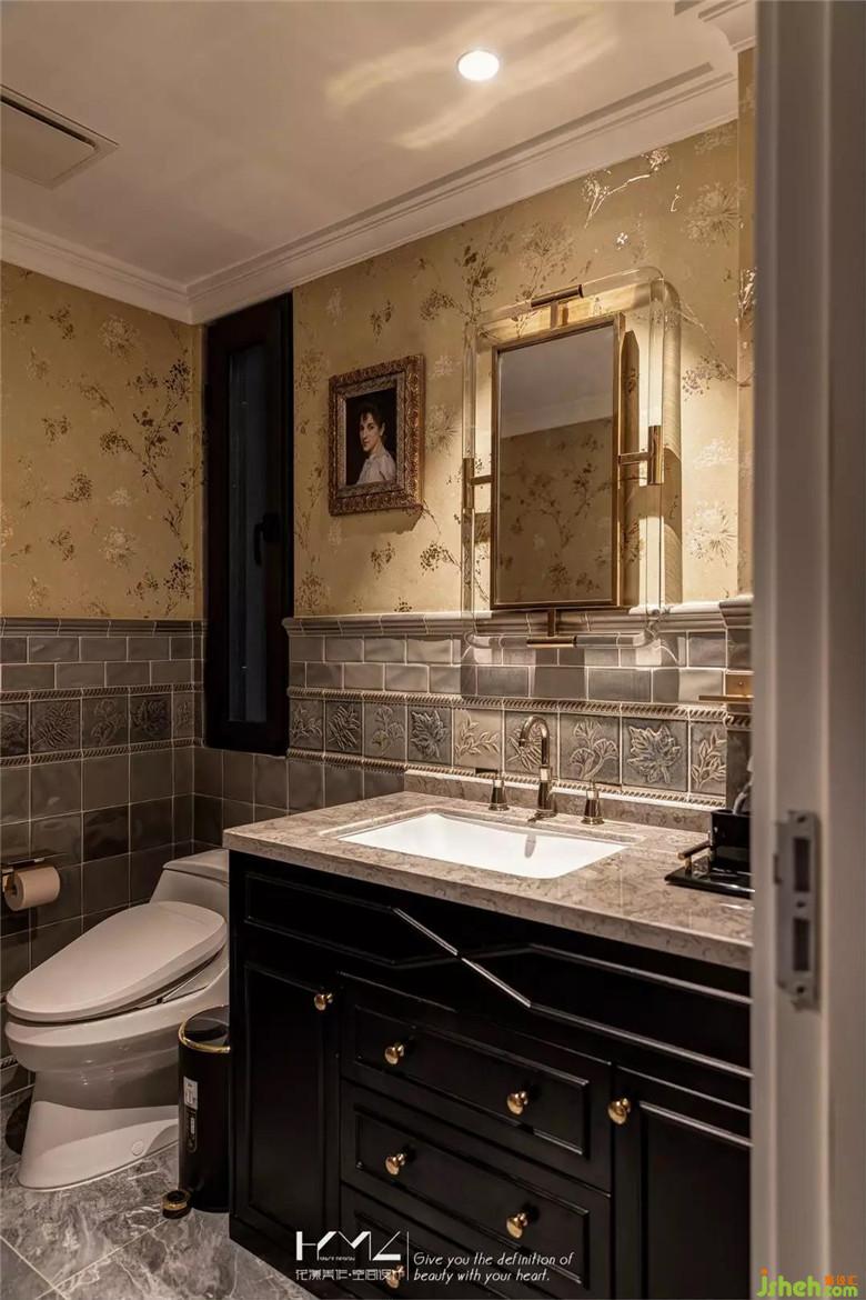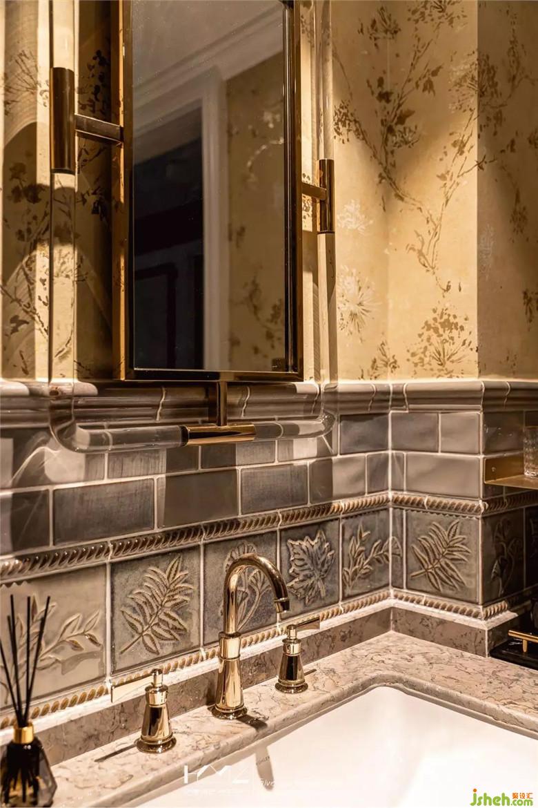 主衛(wèi)的設(shè)計(jì),根據(jù)業(yè)主要求,沒有設(shè)置淋浴功能,地面裝修公司選用深灰色系的磚與半墻仿古拼花磚搭配,上半部分,搭配香檳色系花紋墻紙,枝葉都是金箔反光質(zhì)感,讓主衛(wèi)空間融入整體,弱化了常規(guī)衛(wèi)生間的冰冷感。