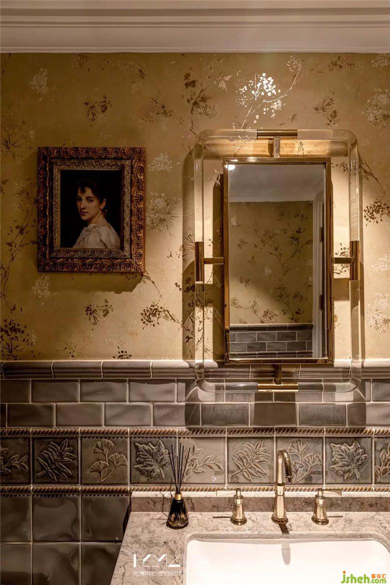 墻面采用上下分色形式,下墻面選用了水磨石紋理粉色壁紙,占比多,上墻面與客廳灰色菱形壁紙呼應(yīng),英國cole&son的現(xiàn)代款,型號是103/14057,中間是兩條pu線條,漆成黑色。