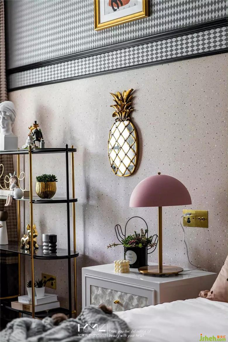 床頭柜上貝殼紋抽屜面板,精致易打理,床頭兩邊燈飾采用非對稱形式,左邊是粉色臺燈,與菠蘿鏡飾和貓咪復(fù)古裝飾畫形成一組裝飾,右邊是壁掛的黑金壁燈,與主吊燈又能呼應(yīng),左右兩邊平衡和諧。窗臺下,橡木做舊紋理寫字桌與挑時的網(wǎng)紅金屬書架高低組合,學(xué)習(xí)之余,眺望窗外的景色。