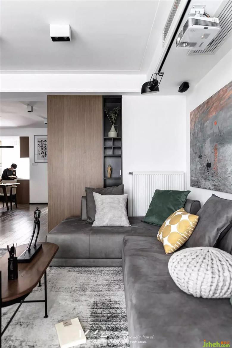 屋主一直有讀書的習(xí)慣,希望能營造家庭讀書的氛圍,而客廳是整個(gè)家最核心的區(qū)域,讀書、藏書的功能在這個(gè)區(qū)域可以發(fā)揮的淋漓盡致。投影幕布代替電視機(jī),釋放柜體空間,整排書柜既實(shí)現(xiàn)了書籍的放置,裝修公司也解決了收納的問題。書柜的木質(zhì)柜門仿照KD板的顏色和木紋做油漆門,反復(fù)調(diào)色確認(rèn),盡可能縮小色差,統(tǒng)一木色。